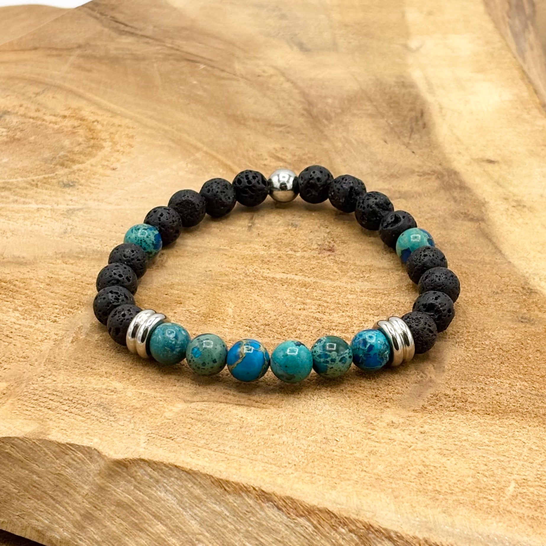 Bracelet homme fait de pierre naturelle 8mm en jaspe impérial et pierre de lave avec des éléments décoratifs en acier inoxydable blanc.