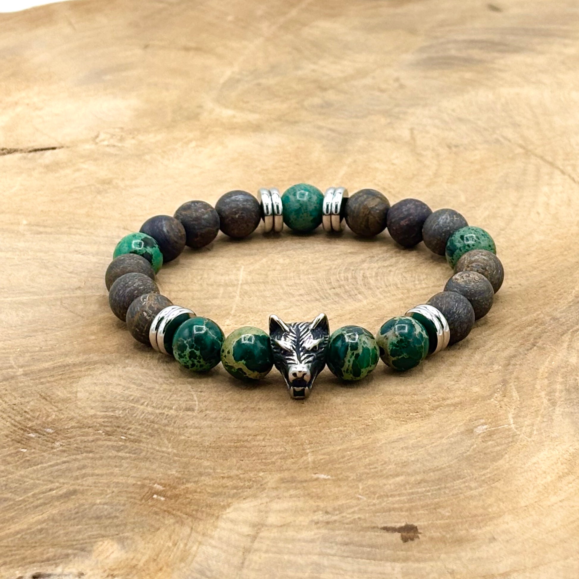 Bracelet homme fait de pierre naturelle: bronzite mate et jaspe impérial vert, avec des éléments décoratifs en acier inoxydable blanc.