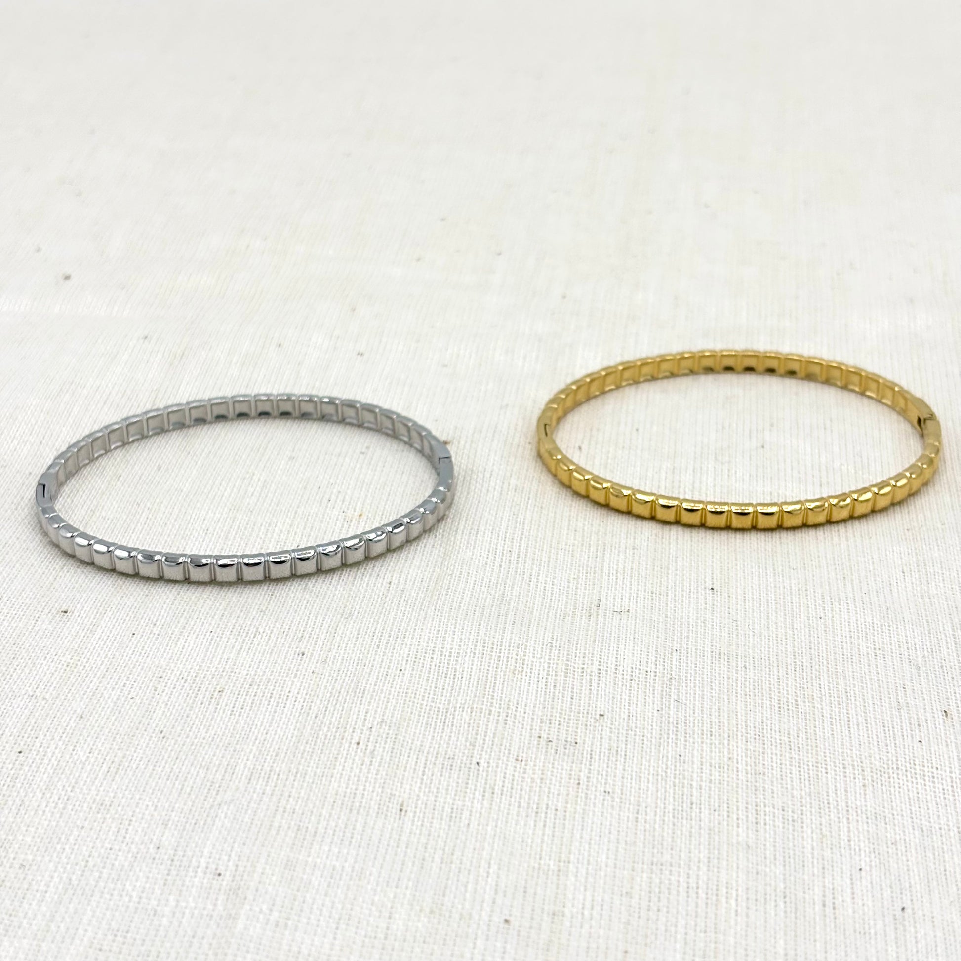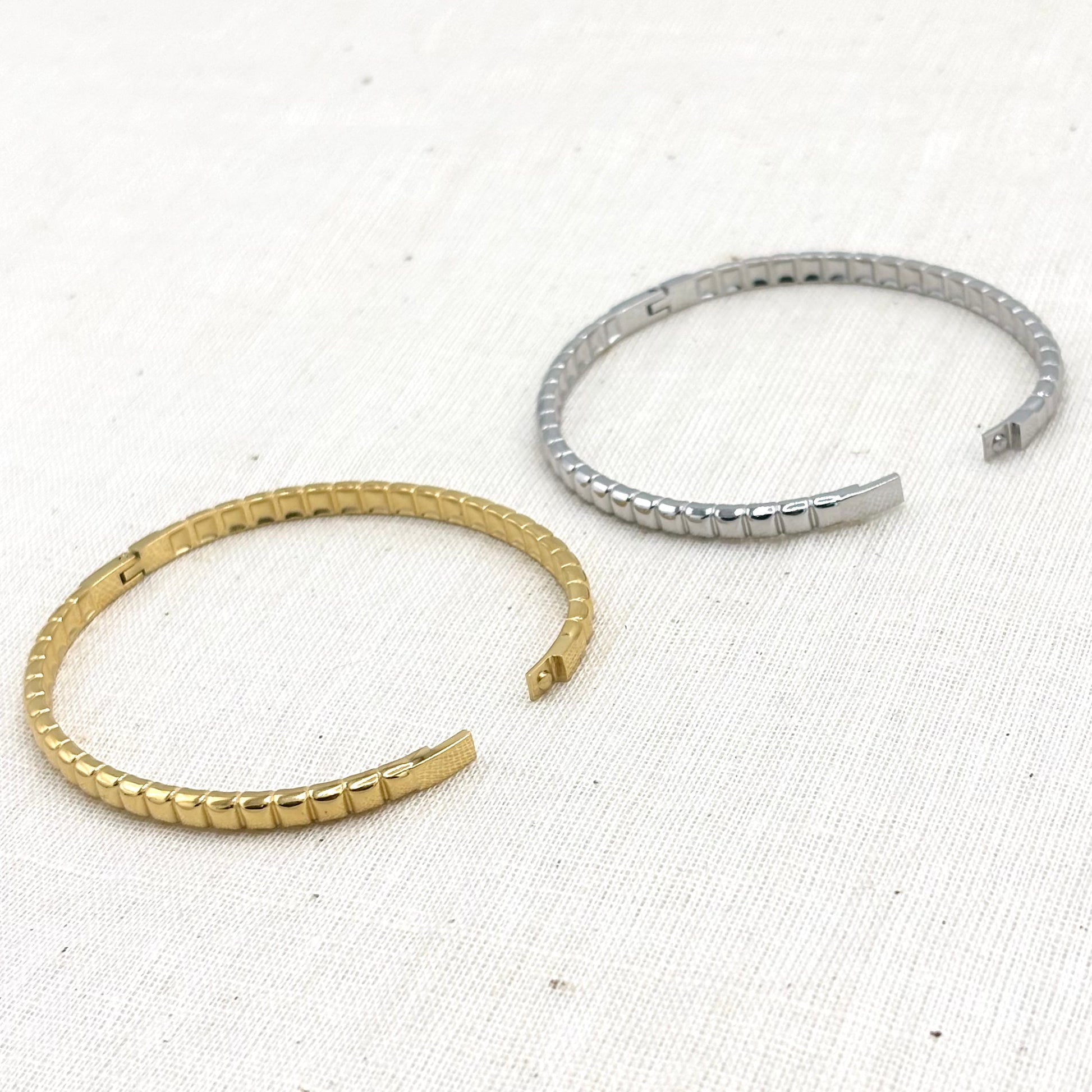 Bracelet jonc en acier inoxydable blanc, disponible en blanc ou doré.
