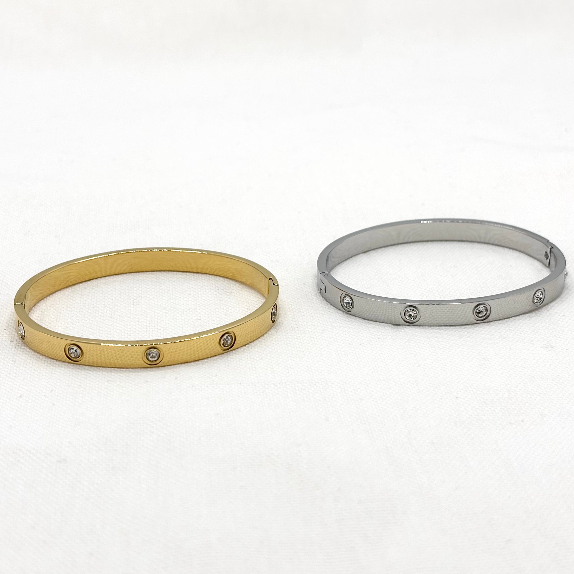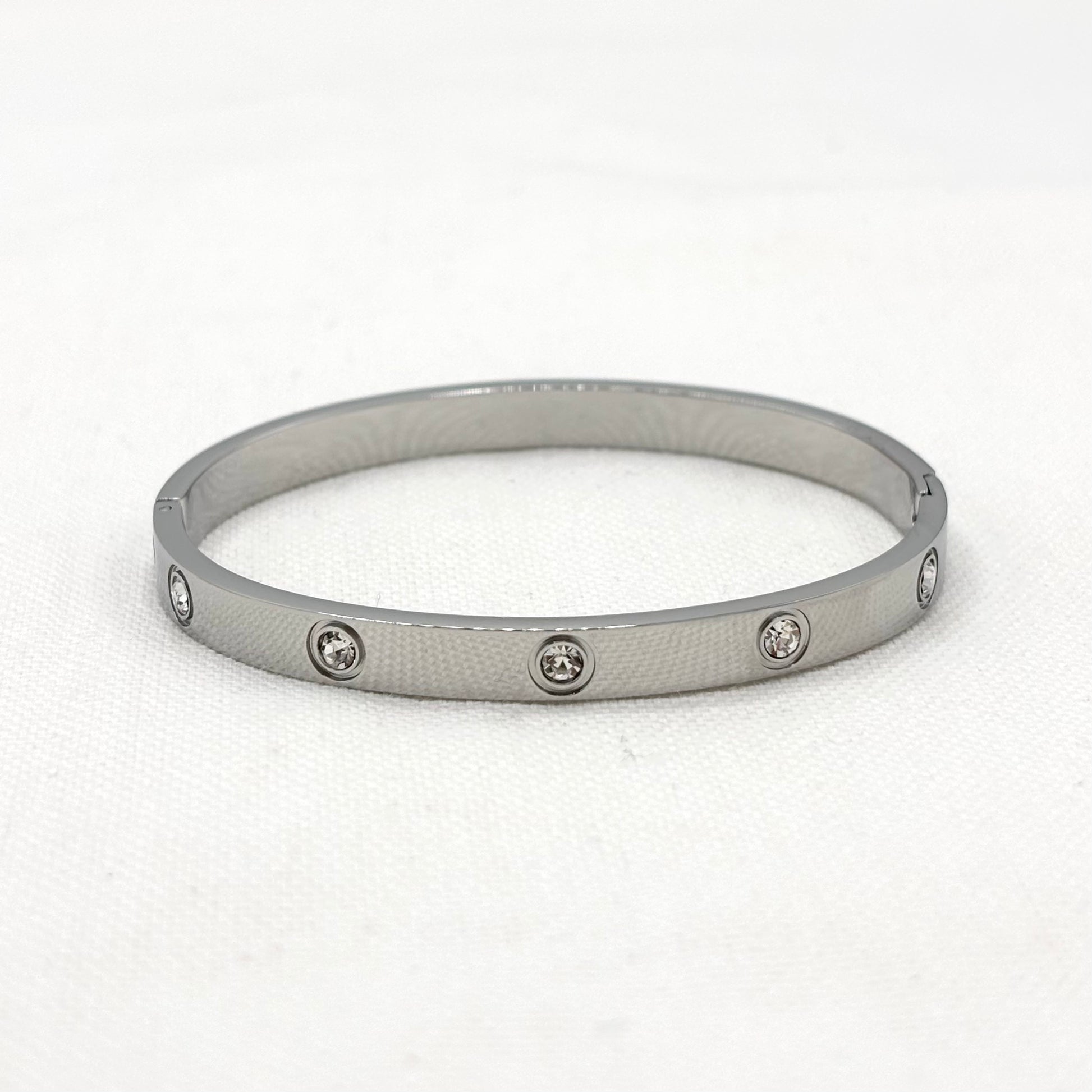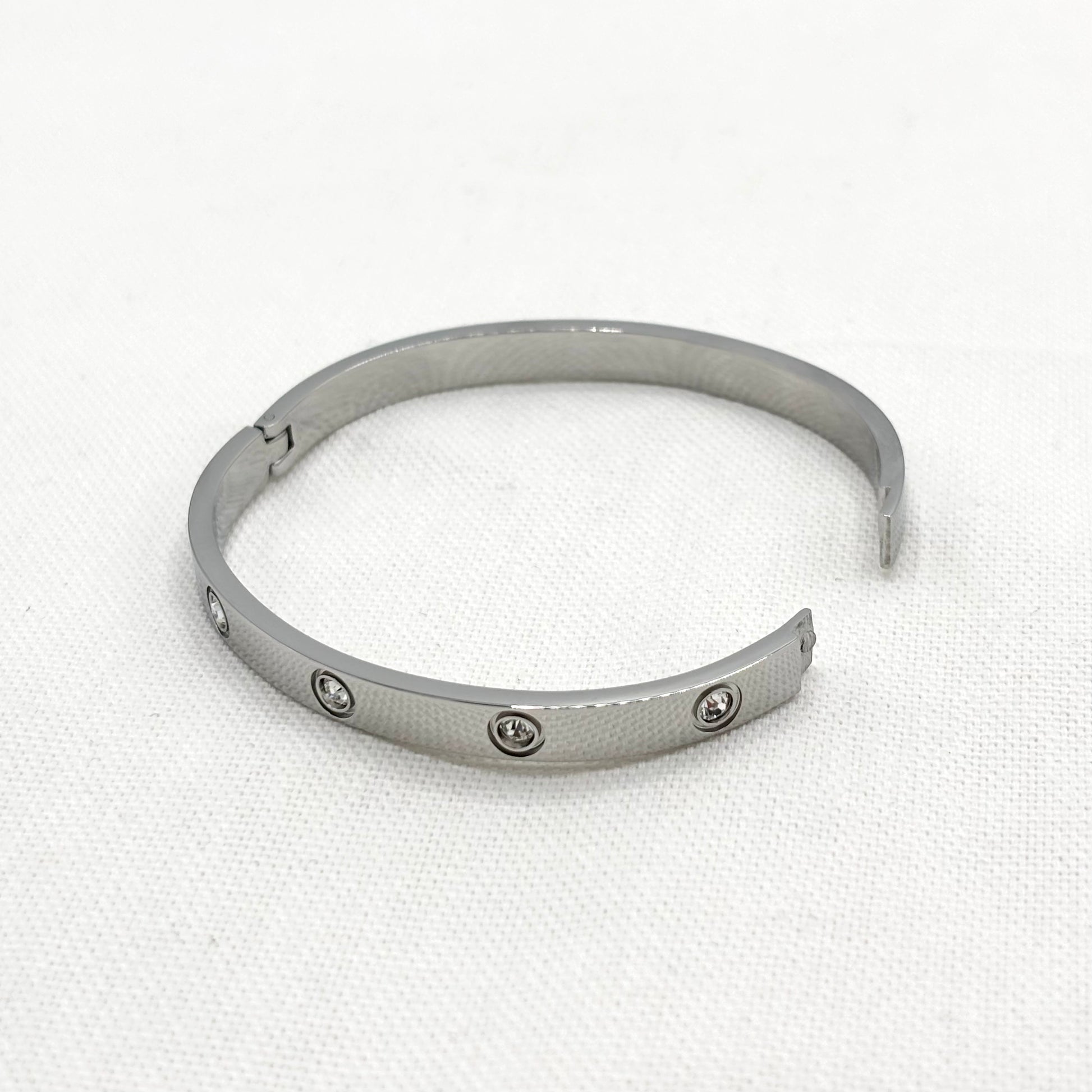 Bracelet jonc en acier inoxydable blanc avec 10 strass incrustés et un fermoir à cliquet.