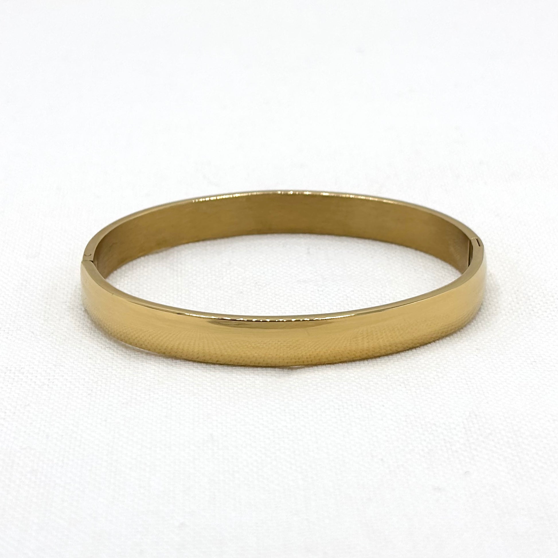 Bracelet jonc en acier inoxydable doré avec un fermoir à cliquet.