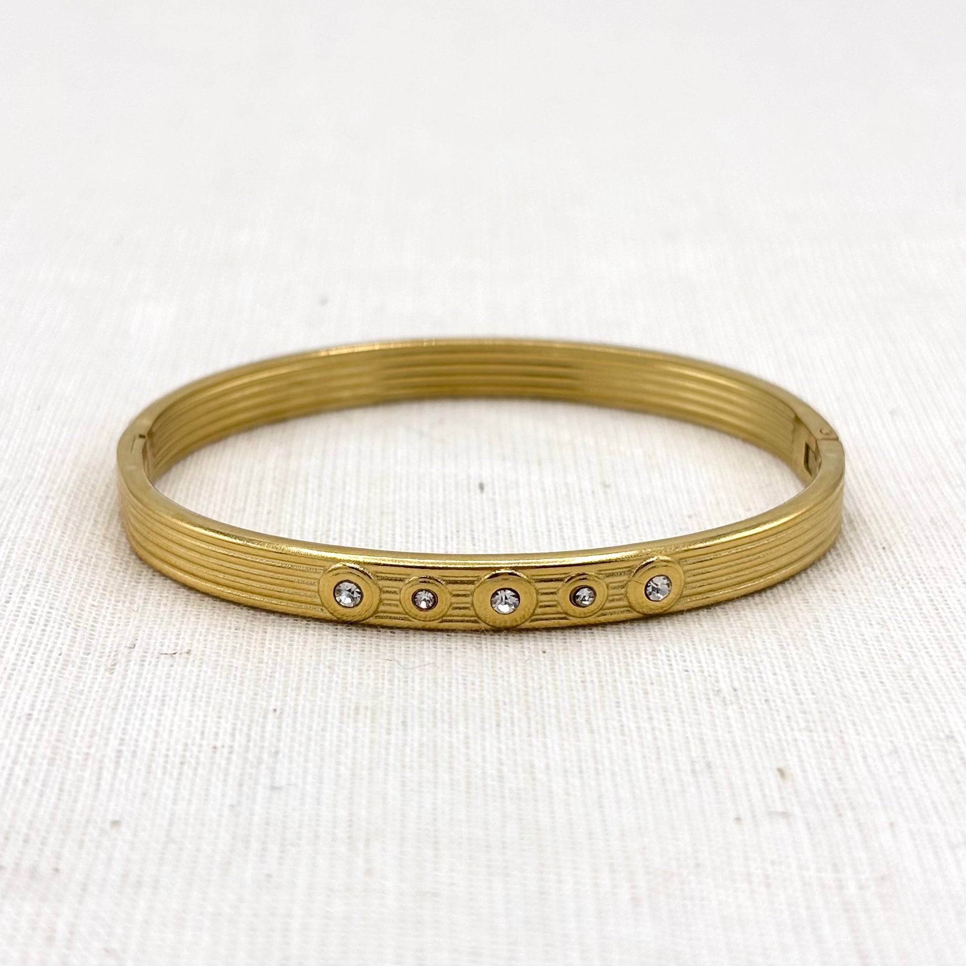 Bracelet jonc en acier inoxydable avec 5 strass, disponible en blanc ou doré.