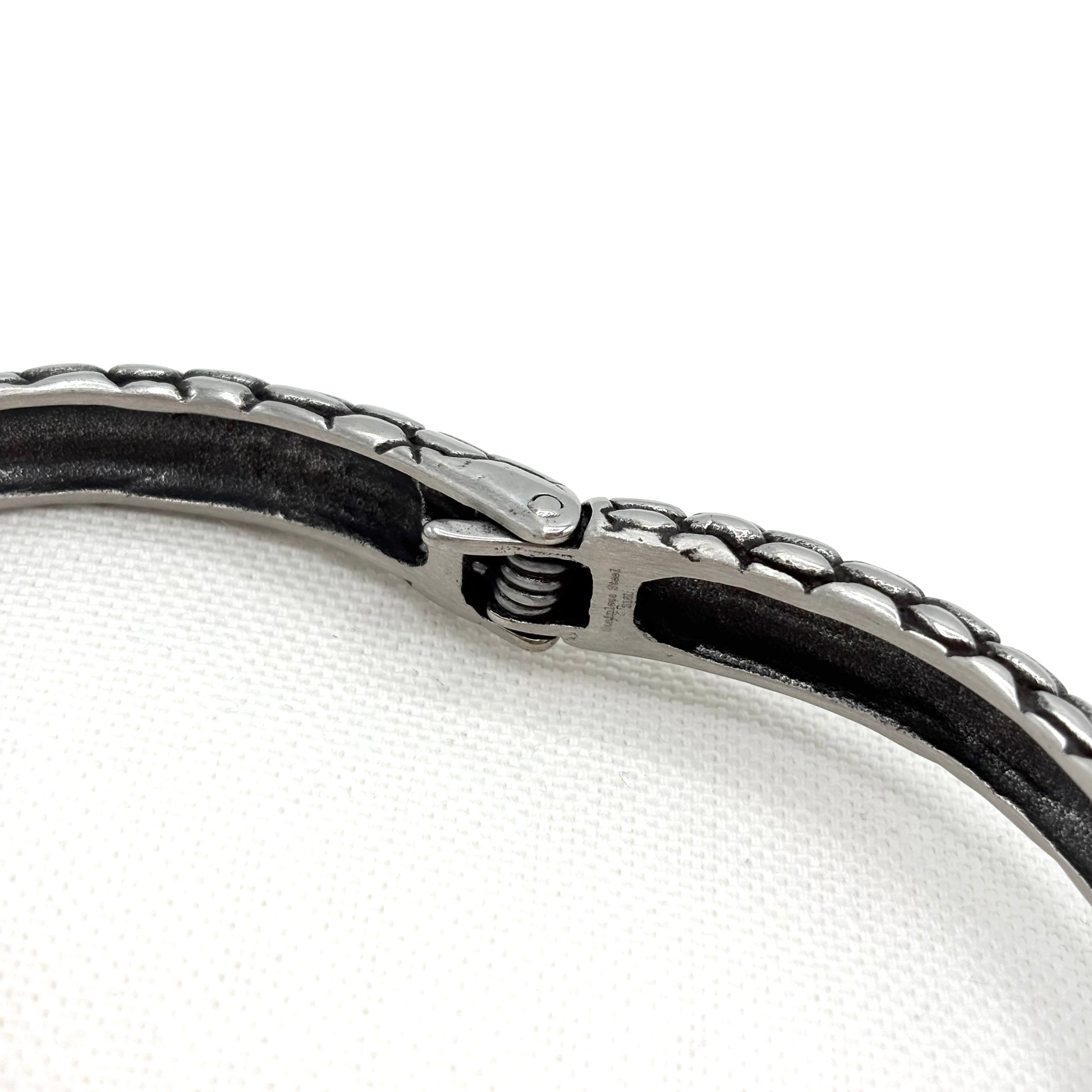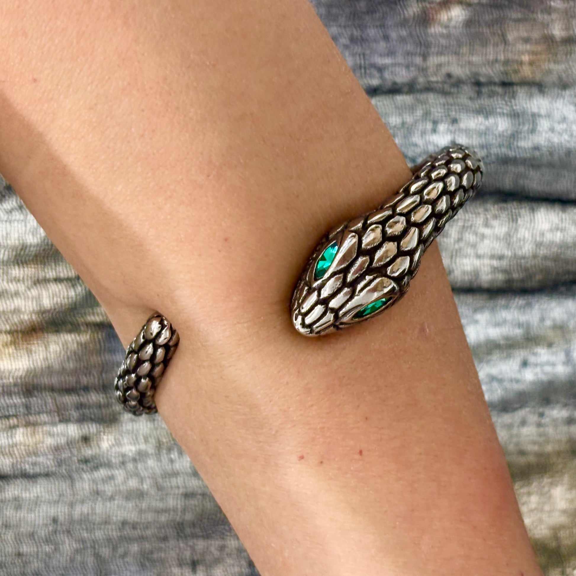Bracelet serpent aux yeux en pierre verte et en acier inoxydable blanc avec une ouverture/ fermoir mécanique