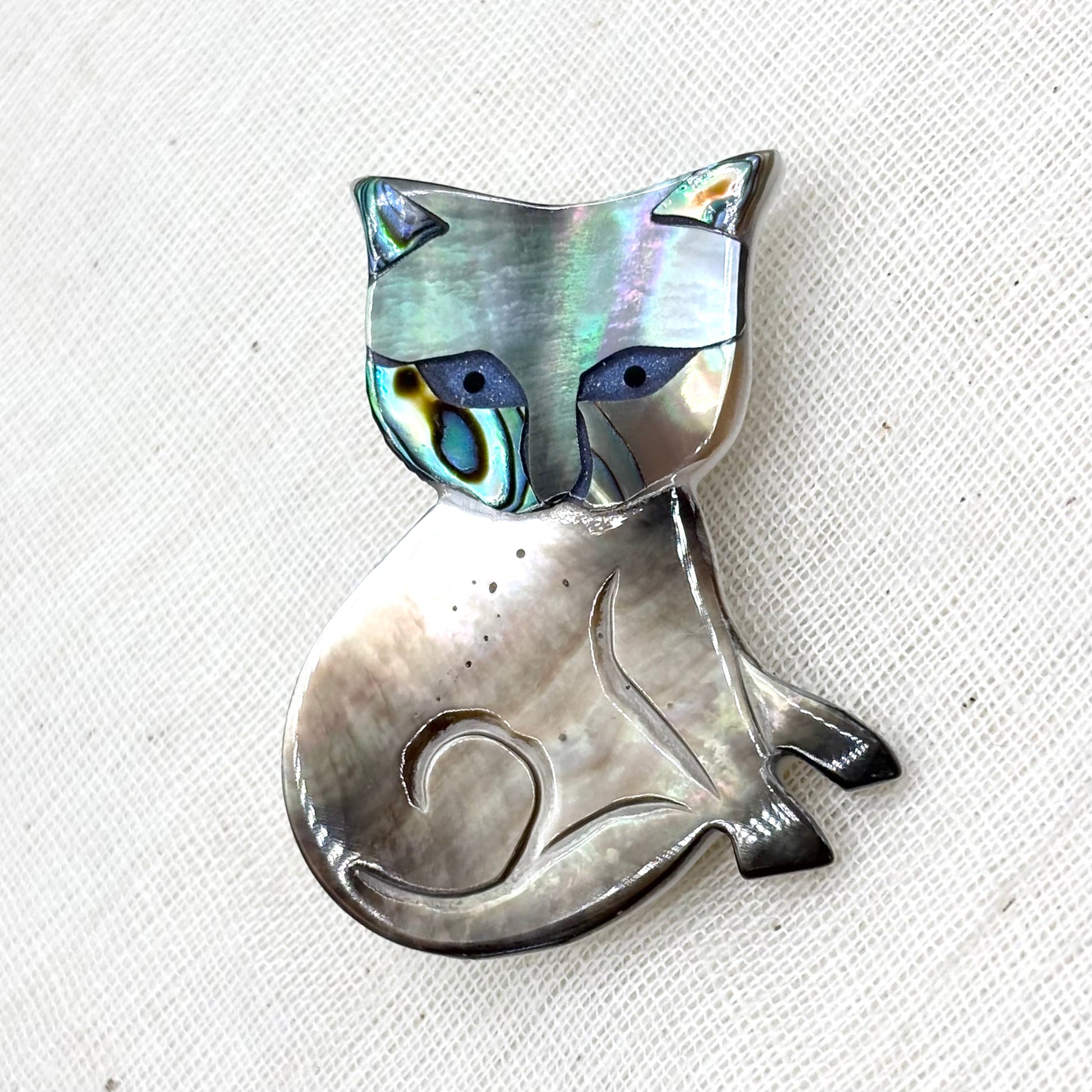 Broche en forme de chat faite d'abalone avec un fermoir style épingle